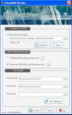 Con el GhostMSN Builder creamos el fake del live msn, para ello debemos colocar nuestro servidor ftp usuario y pasword (se pueden crear una cuenta en miarroba.com o en www.ueuo.com)